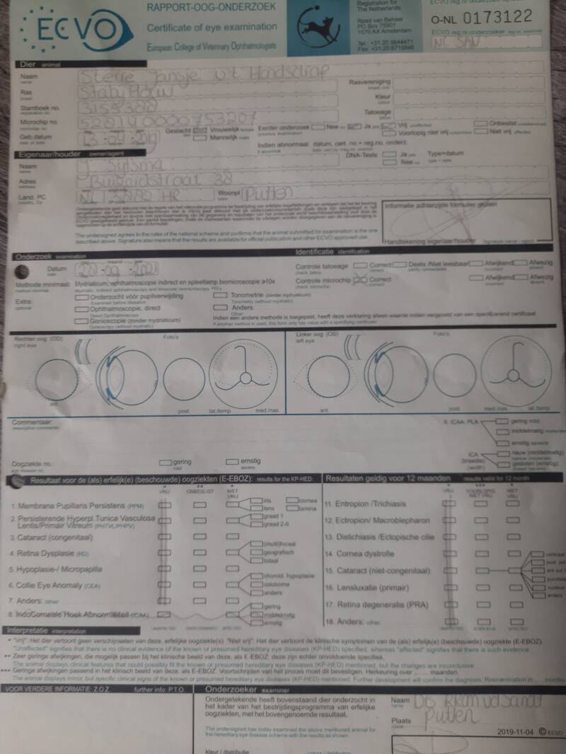 Lena heeft haar 2e ECVO Oogonderzoek gehad. Overeenkomstig het 1e onderzoek in 2019 zijn beide ogen "vrij voor de als erfelijk beschouwde oogziekten". Geldigheidsduur van de resultaten is 12 maanden.
