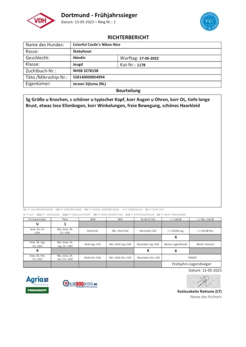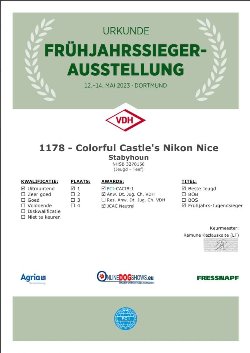 - 1e plaats Uitmuntend - FCI-CACIB-J - Beste Jeugdteef- Beste Jeugdhond- Frühjahrs-Jugendsieger 2023