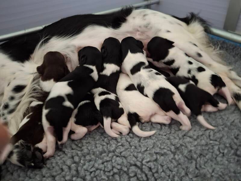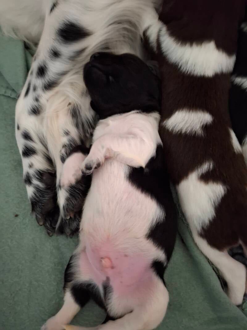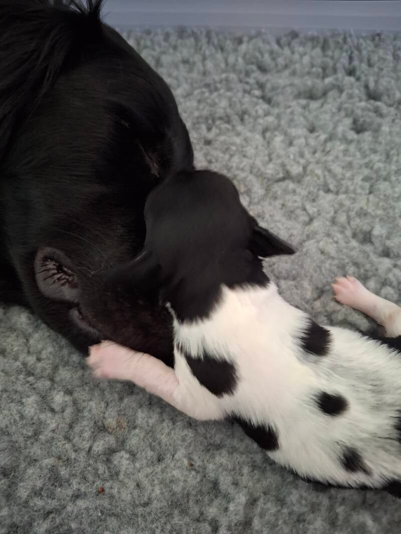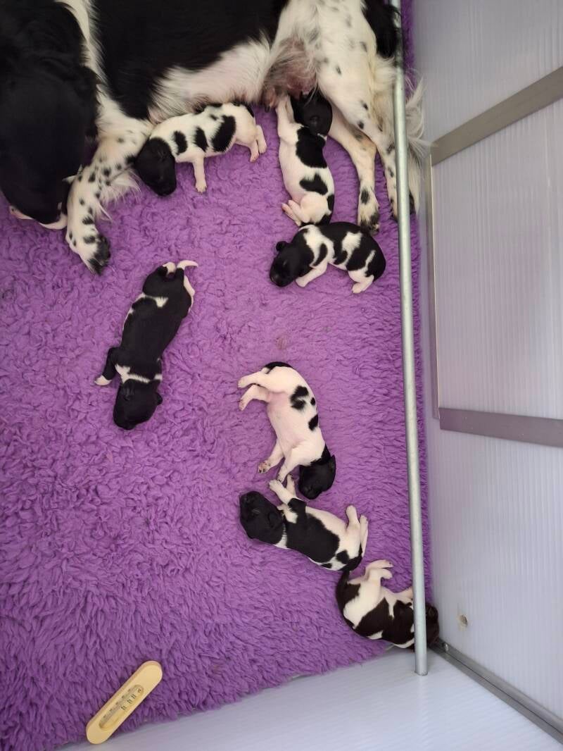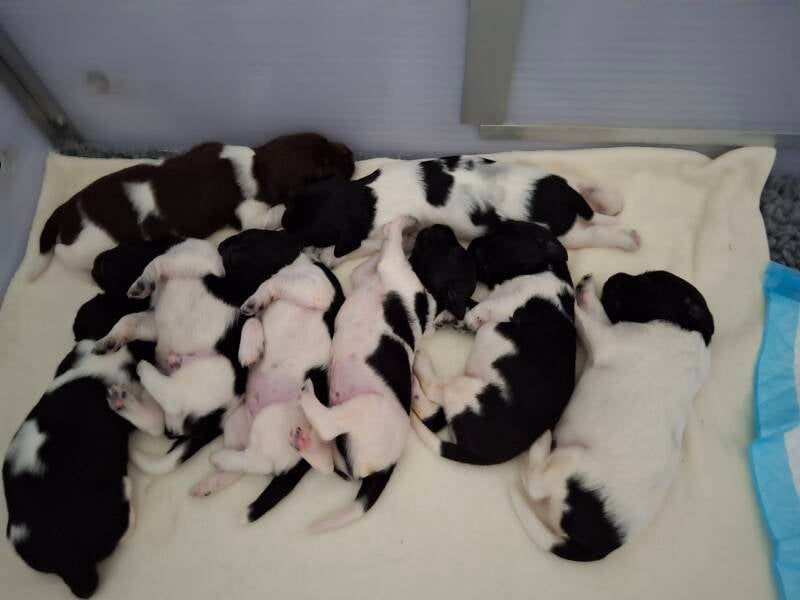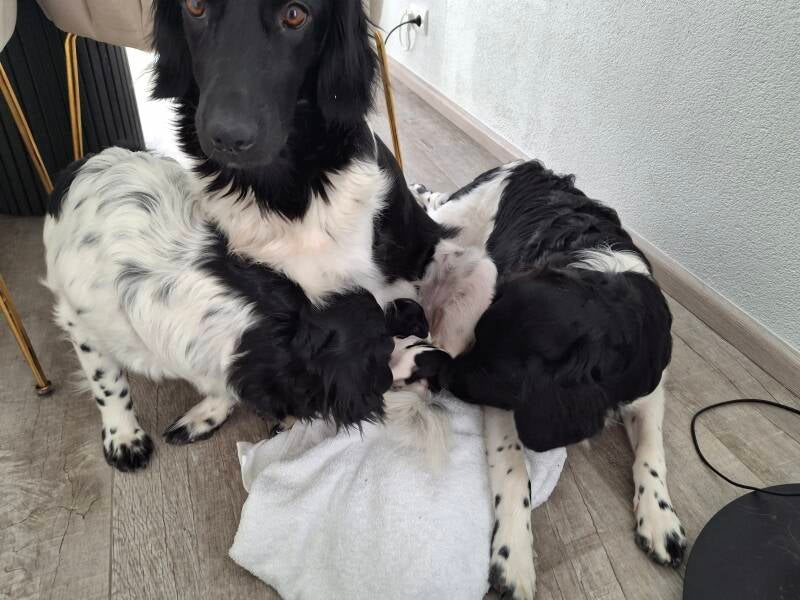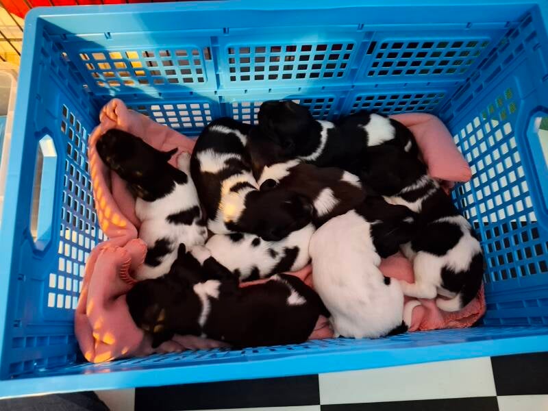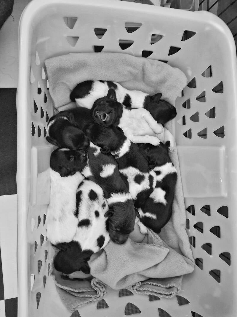 Puppies in de wasmand zodat werpkist schoongemaakt kan worden.